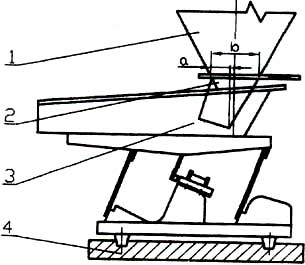 電磁振動給料機的振幅和給料量受料倉倉壓影響較大,設計料倉時應盡量減少倉壓,使溜咀后側板承受一定的倉壓,并設置斜溜沮及下料閘門。如圖,一般a=1/4b。溜咀四周應與給料槽留有一定的間隙,一般5~10mm,以免產生噪音及影響振動。